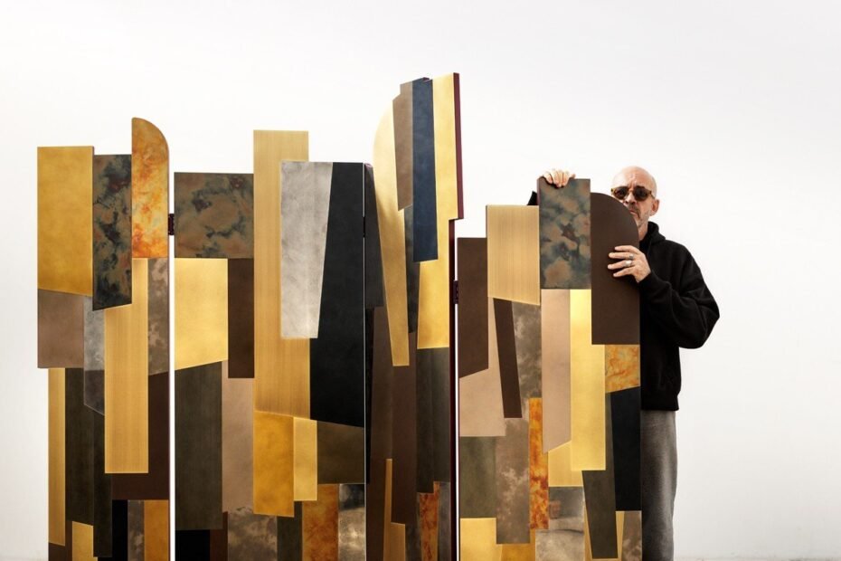 O conjunto inclui ainda gabinetes como Celato Skeria e Ziqqurat, além de aparadores e buffets em latão envelhecido, todos concluídos com acabamento manual. “Meu olhar sobre o metal é quase infantil; não entendo o processo metalúrgico, mas sei o resultado que procuro no design”, afirma Marras.