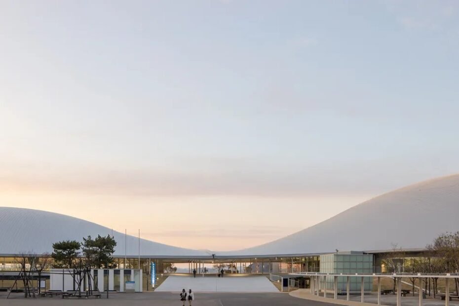 Concebida pelo estúdio SANAA, a arena — também chamada Anabuki Arena Kagawa — reúne três ginásios independentes sob um teto ondulante que remete às ilhas do mar interior de Seto. Ambientes abertos, ausência de paredes internas e abundante luz natural marcam o conjunto.