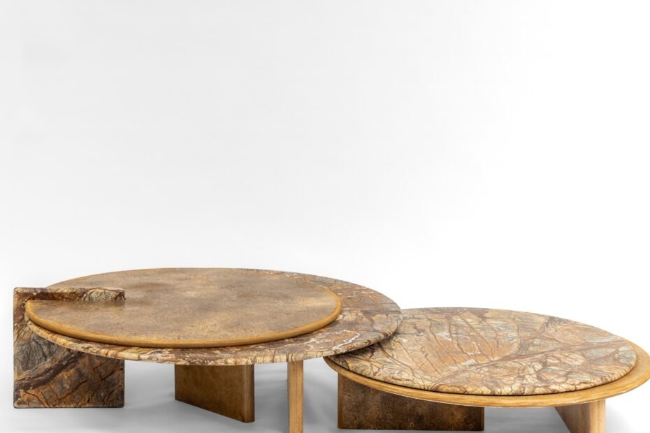 A série explora diferenças visuais e táteis ao mesclar o plástico moído com fragmentos de mármore, quartzito e outros rejeitos de mineração. A arandela Placa Açafrão utiliza mármore Rain Forest Brown, enquanto a mesa lateral Prisma Argila Verde incorpora quartzito Green Bamboo. Já a mesa lateral Argila Marrom e a arandela Prisma Açafrão reforçam a variedade cromática obtida com corantes naturais.