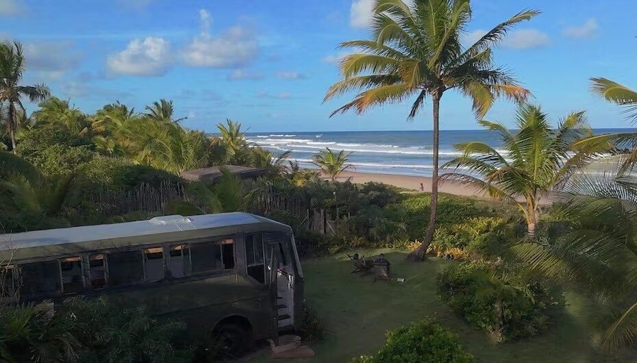 Um ônibus totalmente reformado em 2025 passou a funcionar como acomodação para viajantes no Sítio Pura Vida, localizado na Praia dos Arandis, em Maraú, no litoral sul da Bahia.