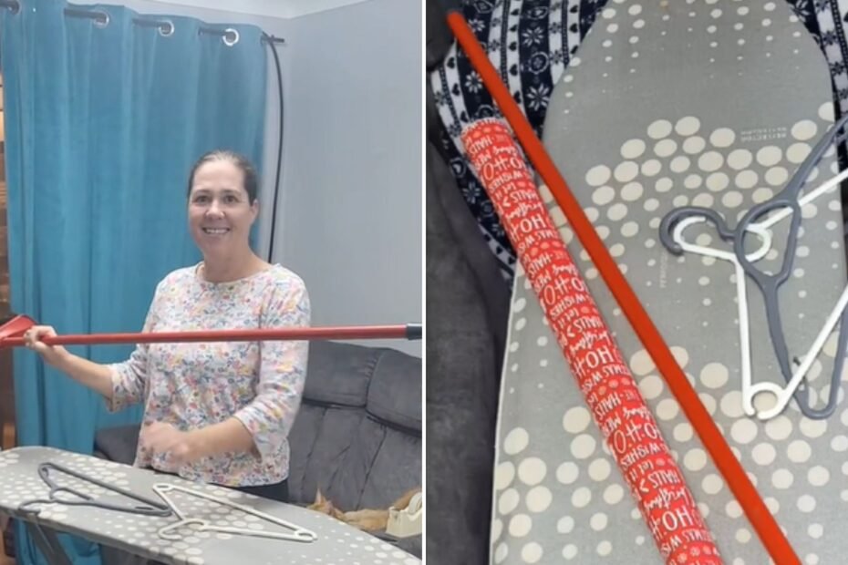 No vídeo, Lee posiciona dois cabides nas extremidades de uma tábua de passar, mantendo os ganchos virados para baixo. Em seguida, ela passa o cabo de uma vassoura pelos ganchos e encaixa o rolo de papel de presente na haste. O resultado é um suporte improvisado que permite desenrolar o papel com facilidade.