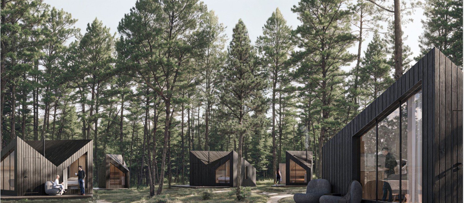 Hotéis que adotam linguagem arquitetônica derivada da paisagem priorizam baixo impacto sobre o terreno. Cabanas em formato de pinha projetadas pela GLA em Dongmingshan, China, e o complexo Desert Rock, na Arábia Saudita, do escritório Oppenheim Architecture, seguem o princípio de camuflar as construções no relevo, protegendo ecossistemas e ampliando a experiência dos hóspedes.